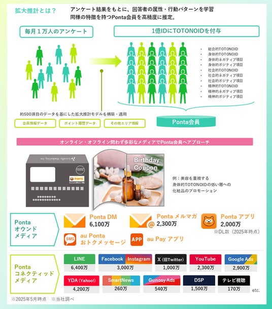 毎月1万人に聴取する「TOTONOID」のアンケート結果を基に、1億人超のPonta会員のそれぞれのととのい度を拡大推計します。利用企業のご要望に沿ったターゲティングの他、郵送DMやPontaアプリなどのLMのオウンドメディアや、外部メディアを利用したプロモーション施策まで、一気通貫したサービスをご提供します。