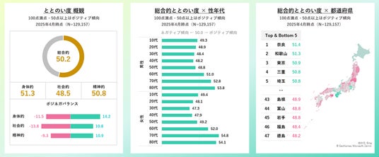 LMは2025年4月、Ponta会員13万人を対象に「TOTONOID」のアンケートを実施しました。「身体的」「社会的」「精神的」の各ととのい度を100点満点で算出し、全72の聴取項目の半分以上を満たした50点以上を「ポジティブ傾向」、50点未満を「ネガティブ傾向」と定義します。