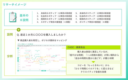 基本の設問に加えて、特定の商品の購買状況など、利用企業が個別に聴取したい内容を+αリサーチとして追加できます。特定の商品を購入した人のととのい度など、設定した条件での分析が可能です。企業のご要望に応じて、任意のセグメントでととのい度を分析の上、レポートをご提供します。