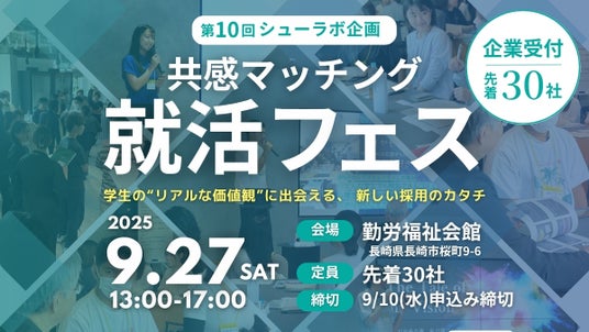 Enagic株式会社(本社:長崎県長崎市、代表取締役:大友 拓海)は、令和7年9月27日(土)13時より勤労福祉会館 (長崎県長崎市桜町9-6)にて、長崎大学他非常勤講師の山口晴信氏と共催で、「第10回シューラボ企画 共感マッチング就活フェス」を開催いたします。