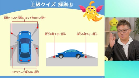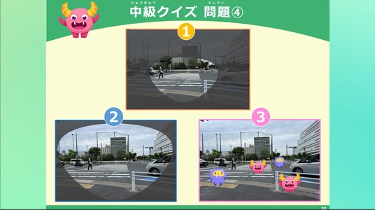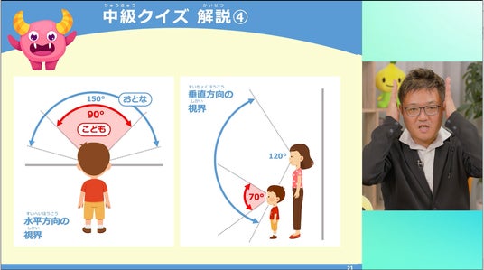 授業では歩行中の交通安全に関わる10問のクイズを初級・中級・上級・超上級に分けて出題しました。例えば、子どもと大人の視界を比較する問題では、実際に子どもと大人が見えている範囲を表示した写真を出題し、子どもと大人で水平方向・垂直方向それぞれで見える範囲に違いがあることを解説しました。授業の最後には10問のクイズをおさらいすることで、歩行中に注意するべきポイントについて児童への定着をはかりました。