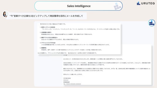 有望企業のリストアップから、個人に最適化されたメール作成までをウルテクAIエージェント(α)が全自動化します。インテントデータに基づき「なぜ連絡したのか」が明確なメールを瞬時に生成し、返信率を改善します。営業担当者は文面作成から解放され、顧客との対話など本来の業務に集中できます。