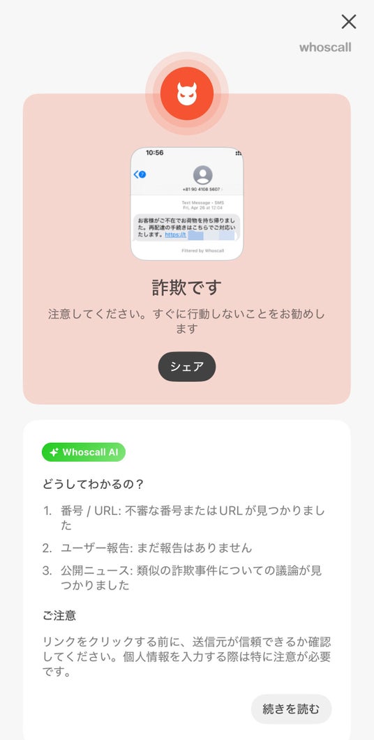 Whoscallは、不審な番号からの着信やショートメッセージ(SMS)、危険性のあるウェブサイトを検知する、世界ダウンロード数1億超の詐欺対策アプリです。東・東南アジア最大級となる26億件の電話番号データベースとAI技術を用いて詐欺で利用される電話番号や危険性のあるウェブサイト(URL)を検出し、ユーザーを詐欺や迷惑電話から守ります。