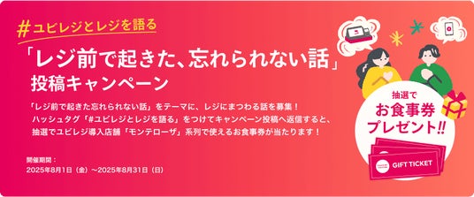 15周年を記念して、ユビレジ公式X(旧Twitter、https://x.com/ubiregi)と公式instagram(https://www.instagram.com/ubiregi/)にて、「レジ前で起きた、忘れられない話」投稿キャンペーンを実施いたします。投稿いただいた方の中から抽選で、ユビレジ導入企業である「モンテローザ」系列店舗で使えるお食事券をプレゼントします。実施期間:2025年8月1日(金)~8月31日(日)