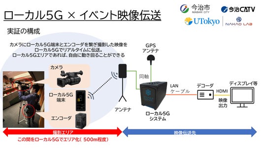 今治市では2024年に、東京大学大学院工学系研究科中尾研究室(以下「中尾研究室」)と今治CATVが連携し、市公会堂でローカル5Gの映像伝送実験を実施しました。有線伝送と比較しても遜色ない映像品質を確認し、さらにケーブルレスによる作業の軽減、撮影の自由度向上といった多くのメリットを実感しました。今年の実証はさらにスケールを拡大し、8月2日(土)、3日(日)に開催される今治市民のまつり「おんまく」をフィールドとして、屋外で多くの人が集まる環境下における映像品質や利便性を検証します。祭りの熱気と密集の中で、ケーブルを気にせず自由自在にカメラを動かせる未来の可能性が示されることが期待されています。