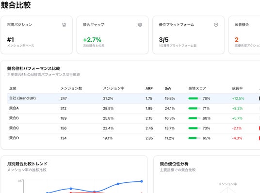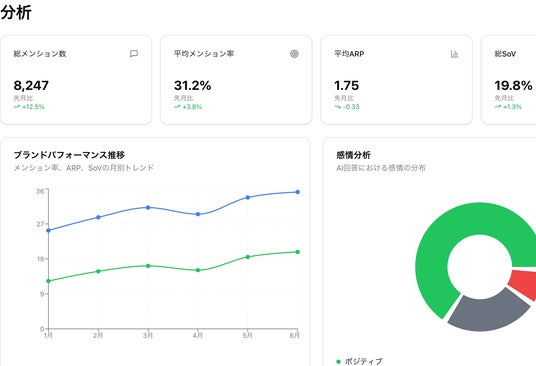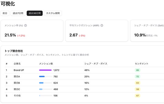 Brand UPのようなAIエージェントはこれを大規模に実行し、AI検索上でのブランドのメンション率・シェア・オブ・ボイス(Sov)・想起率(ARP)などを数値として継続的に可視化できます。