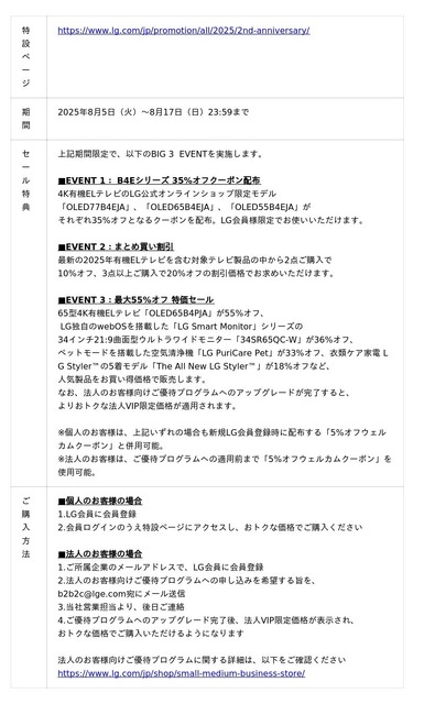 この機会にぜひ、LG公式オンラインショップ内『2nd Anniversary BIG 3 EVENTS』の特設ページ(URL:https://www.lg.com/jp/promotion/all/2025/2nd-anniversary/)ならびに法人のお客様向けご優待プログラムの詳細(https://www.lg.com/jp/shop/small-medium-business-store/)をご確認ください。