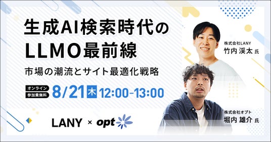 デジタルマーケティング支援を行う株式会社LANY(東京都渋谷区、代表取締役社長:竹内渓太)は、生成AI検索時代のLLMO最前線:市場の潮流とサイト最適化戦略(LANY×株式会社オプト)を8/21(木)に開催いたします。