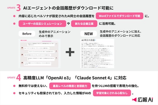 『広報AI』では、プレスリリース生成の際、その内容に応じて、想定されるユーザーペルソナが自動でAIエージェントに設定されます。これらのAIエージェント同士による会話は、これまで生成中のアニメーション内でのみ確認可能でした。