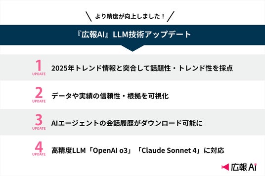 今回はLLM技術のアップデートにより、「2025年のトレンド反映」と「出典表示とロジックの可視化」、「AIエージェントの会話履歴のダウンロード」、「高精度LLM(OpenAI o3、Claude Sonnet 4)への対応」を追加しました。これにより、プレスリリースの生成・採点機能において話題性・正確性および業務効率が大幅に向上します。