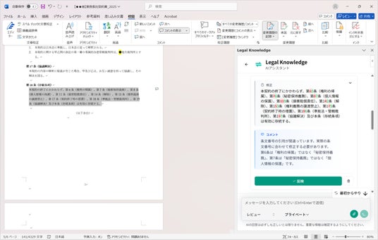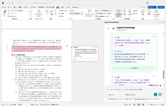 株式会社KenRi(ケンリ、以下「KenRi」という。)は、弁護士業務を支援する生成AI SaaS「Legal Knowledge」に「Wordアドイン」機能を実装しました。契約書作成やレビューで多用されるMicrosoft Word上でファイルを開きながら「Legal Knowledge」の契約書レビューやチャット機能が利用可能となり、これまで以上に弁護士業務の効率化をご体感いただけます。