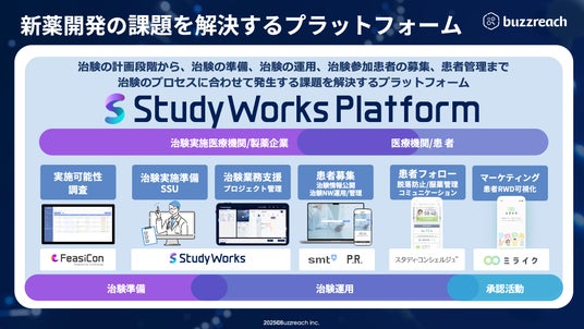 Buzzreachは、「テクノロジーの力で一人でも多くの患者さんに新たな選択肢を」をミッションに掲げ、治験・臨床試験に関わる業務効率化プラットフォームの開発・提供を行っています。主なサービスとして、「StudyWorks」をはじめ、治験情報公開・管理機能「smt」、パートナーサイトを用いたDCT型被験者募集、患者特化型SNSサービス「ミライク」など、製薬企業や医療機関、患者をつなぐソリューションを提供しています。