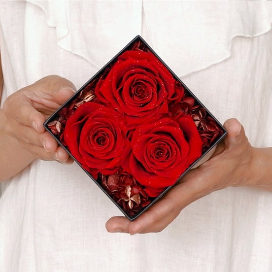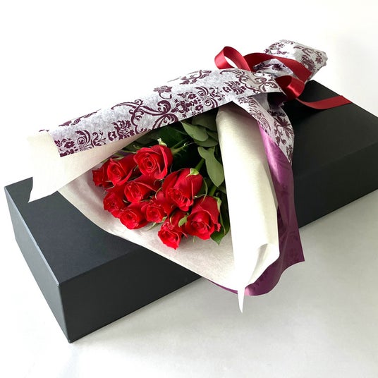 どんな贈り物にもピッタリの赤バラ10本を当社オリジナルの黒いボックスに入れて大人っぽい装いに仕上げます。トランプの柄をあしらった、今回限定のオリジナルメッセージカードもご用意しました。特別な日の贈り物にぴったりです。