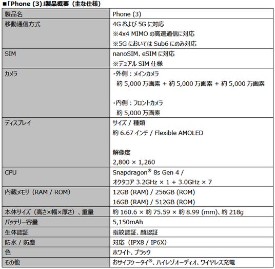 楽天モバイル株式会社(以下「楽天モバイル」)は、国内携帯キャリアで唯一、英Nothingが製造する「Phone (3)」の取り扱いを開始し、「楽天モバイル」公式サイトおよび「楽天モバイル公式 楽天市場店」にて、8月20日(水)午後12時より予約受付を開始、「楽天モバイル」公式サイト、「楽天モバイルショップ」および「楽天モバイル公式 楽天市場店」にて、8月28日(木)午前9時より119,900円(税込)から発売します(注1、2)。本製品は、スマートフォンの常識を覆す革新的なデザインと、背面の光の表示で様々な情報を伝える「Glyphインターフェース」、そしてプロレベルの撮影を可能にする高性能カメラシステムを搭載した、これまでにない5G対応スマートフォンです(注3)。