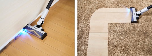 新開発の「青色LEDヘッドライト」が床を明るく照らすことで、目に見えにくいゴミやほこりを浮かび上がらせ、見逃しやすい場所までしっかりと可視化。これまで以上に取り残しなく、徹底的に掃除することが可能になります。