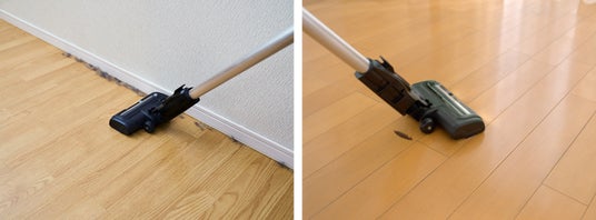 壁際のゴミや掃除機のヘッドの後方のゴミは通常の掃除機のヘッドでは取りづらく、ゴミが残りがち。
