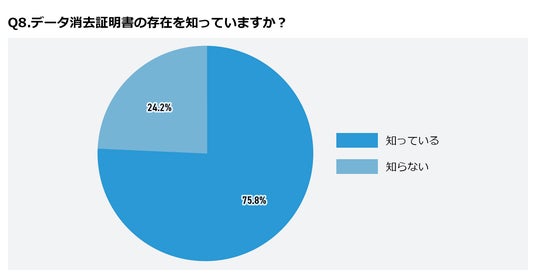 最後に、データ消去証明書についての認知度について確認したところ、75.8%の人が「知っている」と回答しました。