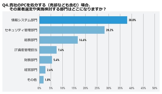 PC処分業者を選定したり、その実施を検討したりする担当部門について尋ねたところ、「情報システム部門」が38%で最多となり、次いで「セキュリティ管理部門」が28.2%となりました。