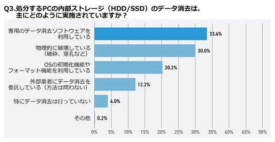 処分するPCのデータ消去方法について尋ねたところ、「専用のデータ消去ソフトウェアを利用している」が33.4%と最も多く、僅差で「物理的に破壊している(破砕、穿孔など)」が30%で続く結果となりました。