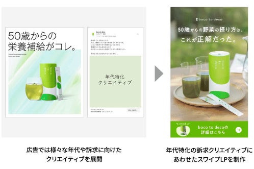 そこで、Letroの支援を通じて、広告で使用している年代特化のクリエイティブにあわせたスワイプ型LPを構築。広告クリエイティブや訴求に応じたLPの作成や改修を低コストで実施することが可能となり、スピーディーにLPO(ランディングページ最適化)を実施できる体制を構築することができました。