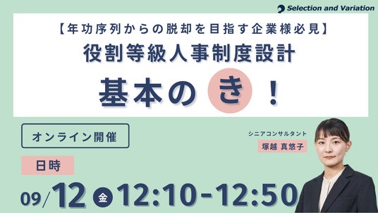 組織・人事コンサルティングファームであるセレクションアンドバリエーション株式会社(以下、当社、東京都千代田区丸の内、大阪市西区、名古屋市西区 / 代表取締役社長:平康慶浩/ URL:https://sele-vari.co.jp/ )は『【年功序列からの脱却を目指す企業様必見】役割等級人事制度設計 基本のき!』セミナーを2025年9月12日(金)12:10~12:50に開催することをお知らせいたします。
