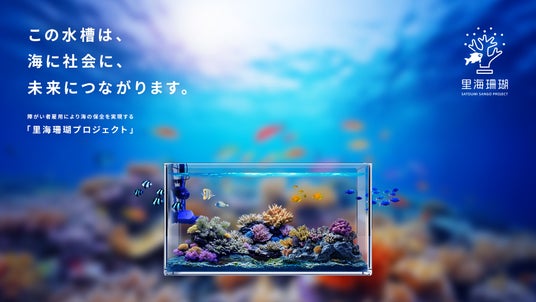 海水温上昇の影響等でサンゴの白化現象が深刻に進む中で、海洋環境保全を推進する企業・自治体・漁協等が協働し、海洋生態系の重要な役割を担うサンゴを陸上で育成し海に還す「里海づくり」を目指す事業です。本事業の核となるサンゴの陸上養殖では、飼育技術を習得した障がいのある方が、独自の高い技術で実現した「水槽DX」により、デジタル技術を最大限活用しながら水槽の環境管理を行い、安定的なサンゴの生育を支えています。障がいのある方が、生活水準の向上に有効なスキルを身に付けて経済活動に参画しながらも、社会的・経済的に自立できる環境と、自身の能力や個性を持続的に存分に発揮できる環境の創出を同時に目指しています。