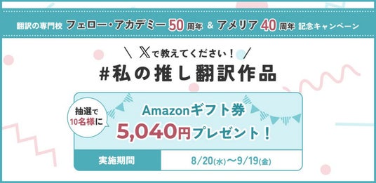 翻訳の専門校「フェロー・アカデミー」と翻訳者ネットワーク「アメリア」を運営する株式会社アメリア・ネットワーク(本社:東京都千代田区、代表者:室田陽子)は、創立50周年と40周年を記念し、Xを活用した「#私の推し翻訳作品 投稿キャンペーン」を開催いたします。