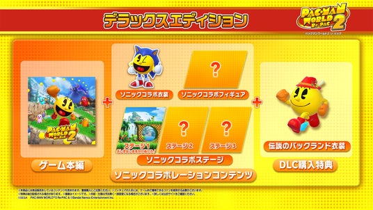 『パックマンワールド2 リ・パック』のゲーム本編に加えて、 コラボレーションコンテンツがセットになったダウンロード版「デラックスエディション」が予約受付中。「ソニックコラボレーションコンテンツ」が入手できることに加え、DLC購入特典として「伝説のパックランド衣装」も入手できます。