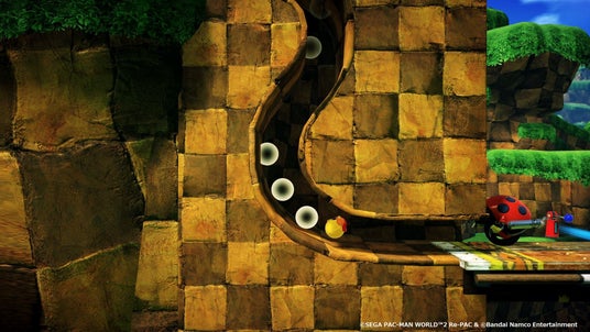青い空に白い雲が浮かび、ヤシの木やトーテムポールが並ぶ南国風の風景。チェッカーパターンの地面や崖など、グリーンヒルの世界観をパックマンワールドに再構築。