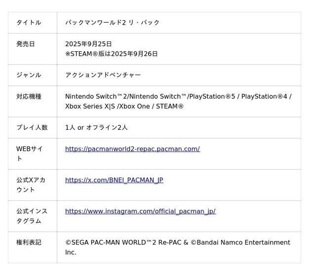 株式会社バンダイナムコエンターテインメントは、Nintendo Switch(TM)2/Nintendo Switch(TM)/PlayStation(R)5/PlayStation(R)4/Xbox Series X|S/Xbox One/STEAM(R)で2025年9月25日発売予定の家庭用ゲーム『パックマンワールド2 リ・パック』 が、ダウンロードコンテンツとして「ソニックコラボレーションコンテンツ」を今冬配信することをお知らせいたします。