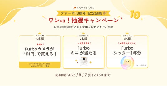 150万人以上のユーザーに愛用される「Furbo(ファーボ)ペットカメラ」を展開する、世界最大級のペットテクノロジー企業であるTomofun株式会社(本社:東京都中央区)は、誕生10周年を迎えるにあたり、日頃のご愛顧への感謝を込めて「10周年記念セール」と「ワンx3 トリプルチャンス抽選キャンペーン」を開催いたします。