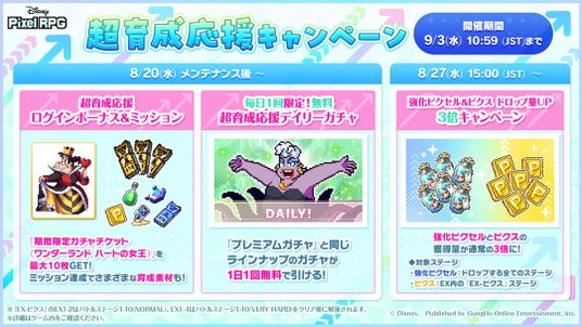 「超育成応援キャンペーン」では、期間中累計7日間のログインで、新キャラクター「ワンダーランド ハートの女王」の期間限定ガチャチケットが10枚獲得できる「超育成応援ログインボーナス」や、クリアすることで「プレミアムガチャチケット」やキャラクターの育成素材がゲットできる「超育成応援ミッション」など、各種イベントを開催いたします。