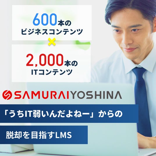 「うちIT弱いんだよねー」からの脱却を目指す学習管理システム(LMS)『SAMURAI YOSHINA』ITスキルが不安な社員が多い企業向けに、基礎からわかりやすく学べる研修内容とサポート体制で、社員一人ひとりの成長を支援し、社内全体のITスキルを底上げします。