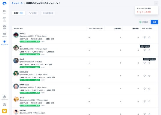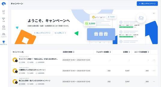 「キャンペーン機能」は、X(Twitter)キャンペーンをSocialDog上で一元管理できる機能です。応募状況の確認、当選者・当選候補者の決定、DM送信、効果測定まで一連の対応が可能となりました。