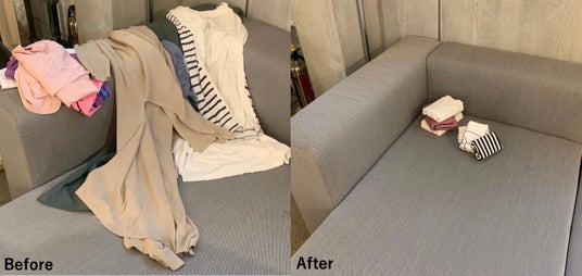圧縮される前の洋服(写真左)、手のひらサイズに圧縮された洋服(写真右)