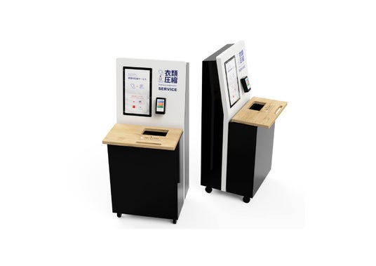 「衣類専用自動圧縮機」を用いた『Pocket Tips(ポケット チップス)』は、洋服などの衣類を専用の機械に入れるだけで、約1分間で “手のひらサイズ※” に圧縮できるサービスです。衣類そのものを自動で圧縮するため、不要なゴミを出すことなく誰でも簡単に利用できます。