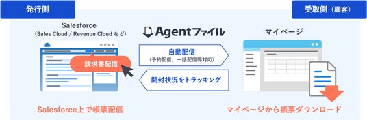 今回追加された「Agentファイル」は、帳票出力DXサービス「帳票DX」およびサブスクビジネス管理サービス「ソアスク」と連携することで、Sales CloudやRevenue Cloudなどから発行される、あらゆる帳票ファイルの作成から配信までの一連のプロセスを大幅に効率化するソリューションとして提供されます。