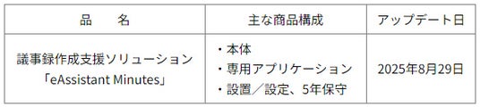 「eAssistant Minutes」は、当社独自のエッジAI技術「CE-LLM」により、外部ネットワークに接続することなく議事録の作成が可能な法人向けのソリューションです。会議での会話を即座に文字起こしするほか、一定量ごとに要約も生成します。「文字起こし」から「話者分離」、「要約生成」まで、すべて本体に搭載のエッジAIで処理するため、ネットワークを介した情報漏洩のリスクを低減します。本年3月の発売以降、機密情報や個人情報を扱う企業、自治体などから高い関心をいただいています。