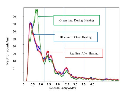 図2:Neutron spectrum obtained during heating (green line) and BG (blue and red line) of the container.