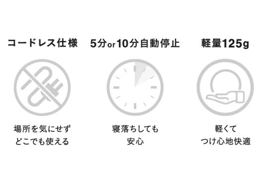 コードレス仕様で場所を選ばず使えるほか、5分・10分の自動停止機能を備えているため、寝落ちしても安心です。さらに、目を圧迫しない構造により、リラックスしながら自然にケアできるのも魅力です。