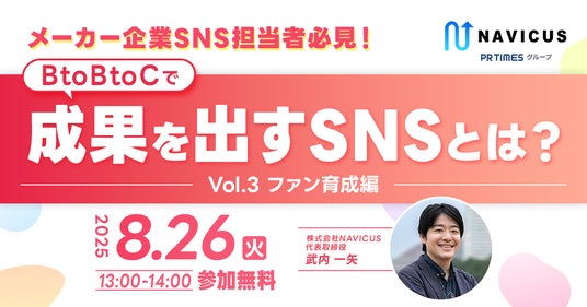 今後も、NAVICUSはSNS上でのブランディング構築やファン獲得を支援する無料ウェビナーを開催する予定です。直近では、今年の4月から全3回構成でお届けしているウェビナー『メーカー企業SNS担当者必見!BtoBtoCで成果を出すSNSとは?』の第3回、ファン育成編を2025年8月26日(火)13:00~14:00に実施いたします。