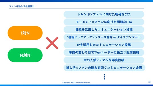 ウェビナー内では、SNS運用の戦略やKPIについて詳しく解説したほか、TVerとNAVICUSで取り組んでいる「ファンを動かす投稿設計」の考え方や具体的な成功事例も多数ご紹介いたしました。