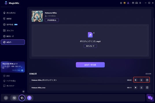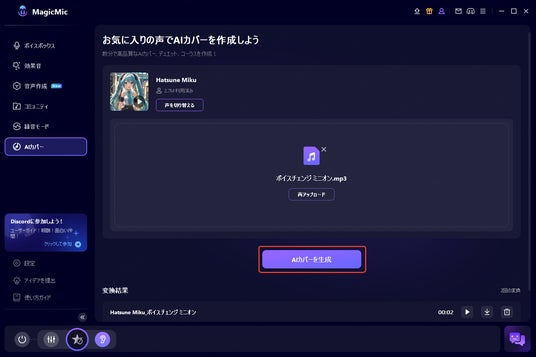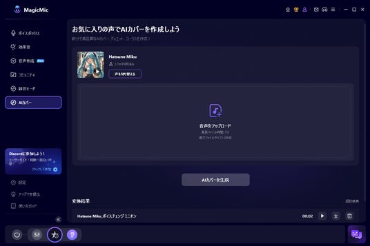 MagicMicのカバー機能は、ユーザーが曲ファイルをアップロードし、好きなキャラクターの声を選んだ後、AIがその声を使って自然に歌うというものです。ユーザーは、最大7分間、最大20MBの音声ファイルをアップロードでき、無料で2回生成できます。この機能により、ユーザーは自分だけのオリジナル曲を手軽に作成することができ、音楽制作の楽しさが広がります。