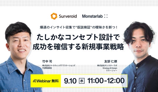 セルフ型アンケートツール「Surveroid(サーベロイド)」を提供する株式会社マーケティングアプリケーションズ(以下、「マーケティングアプリケーションズ」)(本社:東京都渋谷区、代表取締役:竹中 司)は、株式会社モンスターラボジャパン(以下、「モンスターラボ」)(本社:東京都渋谷区、代表取締役:鮄川 宏樹)と共催で、無料オンラインセミナー「爆速のインサイト収集で “仮説検証” の曖昧さを断つ!たしかなコンセプト設計で成功を確信する新規事業戦略」を2025年9月10日(水)11時に開催します。