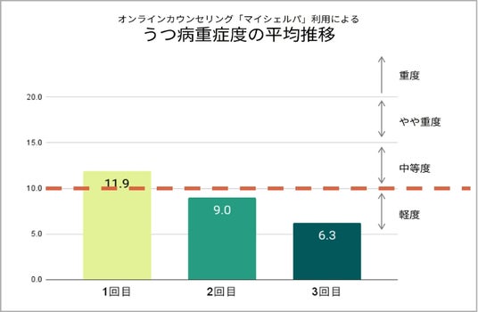 臨床心理士または公認心理師による継続的なカウンセリングにより、利用者のうつ症状が初回は中程度だったものが、3回目には軽度まで改善したことを定量的データにより確認されています。