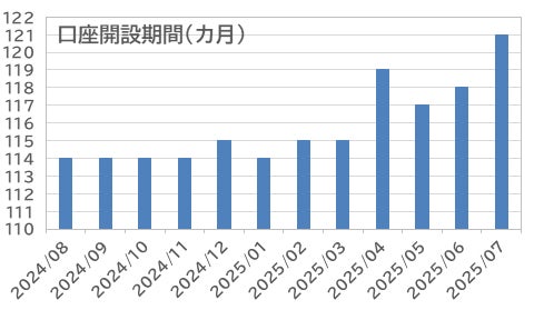 取引をしたFX投資家の口座開設後の期間は、平均121カ月(10年1カ月)と、前月の118カ月から拡大した。