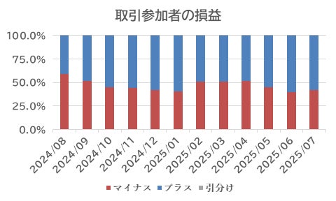 7月のFX取引において実現益を出した投資家の割合は58.1%と、6月の60.0%から低下した。一方で、実現損を出した投資家の割合は41.8%と、6月の39.9%から小幅に上昇した。その他の投資家は収支がゼロだった。米国の関税策、FRBの年内利下げを巡る思惑、本邦の政局が交錯して見通しへの不確実性は残ったものの、世界的な株価安定を受けたJPY(円)安進行で、6月にJPY(円)売りポジションを構築していた投資家の利食いが優勢となった。