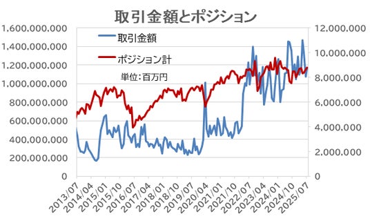 取引金額は約8.2%増加金融先物取引業協会が8月15日に公表した資料によると、2025年7月の店頭FXにおける取引金額は1166兆円と、6月の1078兆円から約8.2%増加した。主要取引通貨ペアではUSD/JPY(米ドル/円)の取引額が約8.7%増加したほか、EUR/JPY(ユーロ/円)が約3.2%増加、GBP/JPY(ポンド/円)が約7.4%増加するなど、クロス円の取引が盛んだった。一方、EUR/USD(ユーロ/米ドル)は約5.4%減少した。また、月末時点の未決済ポジション合計は約8.8兆円で、前月比1.7%増加だった。
