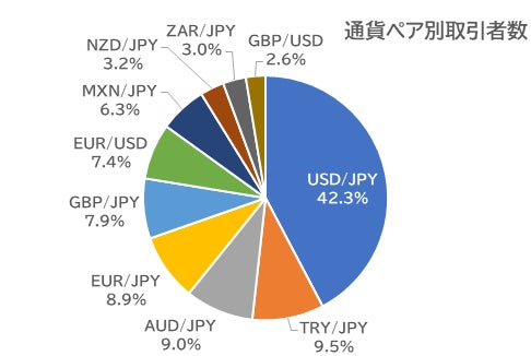 通貨ペア別取引者数のトップ10は、USD/JPY(米ドル/円)・TRY/JPY(トルコリラ/円)・AUD/JPY(豪ドル/円)・EUR/JPY(ユーロ/円)・GBP/JPY(ポンド/円)・EUR/USD(ユーロ/米ドル)・MXN/JPY(メキシコペソ/円)・NZD/JPY(NZドル/円)・ZAR/JPY(南アフリカランド/円)・GBP/USD(ポンド/米ドル)の順で、順位の入れ替わりはなかった。
