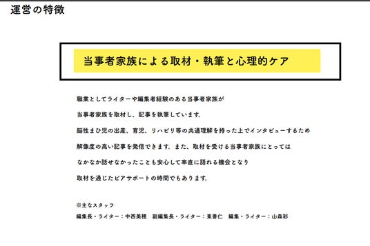 意識して取り入れているのは障害児を取り巻く社会的な課題です。一昔前と比較すると、各段に障害児者を取り巻く環境は整備されましたが、まだまだ不整備な点が多くあります。その点を記事に散りばめ、記事を通して社会問題を提起しています」(理事長・中西美穂)